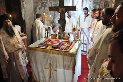 Митрополит Амфилохије је вечерас предводио литију са моштима Светог Симеона Дајбабског од цркве Светог Ђорђа до кућа Ђечевића, гдје се и данас налазе остаци древног храма Светог апостола и јеванђелисте Марка.