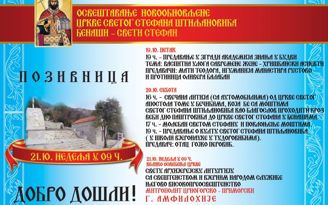У недјељу, 21. октобра Ђенашима код Светог Стефана биће освештана новообновљена црква Светог Стефана Штиљановића.