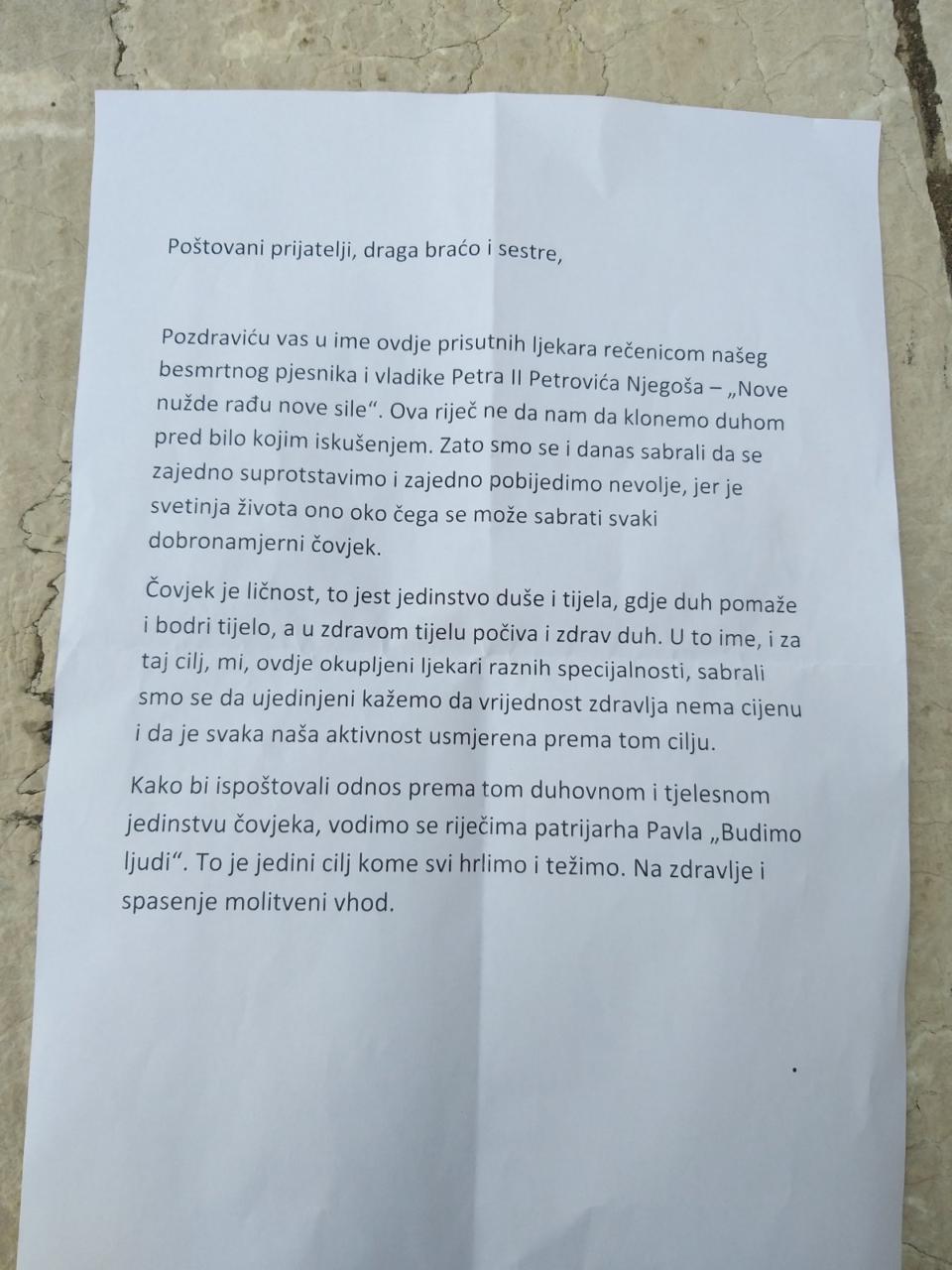 ,,Искористивши ситуацију да се Црква и свештенство дискриминишу и нападају ових дана, безбожници су се дрзнули да још и пријете, шаљући пријетеће поруке. Поручујемо им да нас неће заплажити. Они треба да се стиде својих недјела, док смо ми одавно своје животе уткали у темеље ових храмова. Ми идемо до славне Христове побједе. Иако нијесам пророк, знам да ова наша борба има само један исход, а то ће бити Христова побједа и побједа оних који иду за Њим“- поручио је отац Милосав позивајући вјернике да поштују мјере НКТ-а, да у литији не буде ружних ријечи, нити погледа и да не насиједају на провокације, јер је литија молитва, а молитвом се побјеђује.