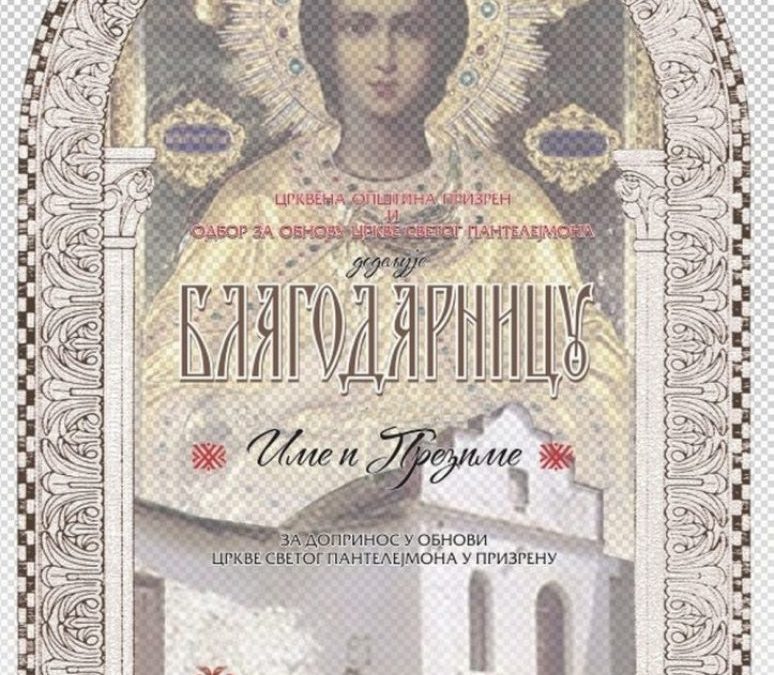 Уз Божју помоћ и благослов Његовог преосвештенства Епископа рашко-призренског г. Теодосија, успјешно је приведена крају акција прикупљања средстава за обнову древне Цркве Светог великомученика Пантелејмона у Призрену. Захваљујући прилозима бројних вјерника, људи добре воље и племенитих намјера за врло кратко вријеме прикупљена су средства потребна за обнову овe наше средњевјековне светиње.