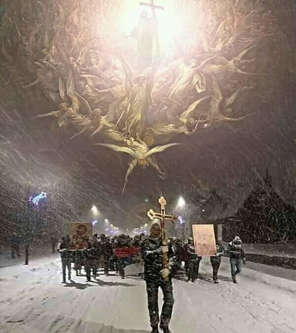 И опет иста дилема – ко кога води и предводи, да ли свештеници народ или народ свештенике? Чудотворне и животворне мошти, заиста сте моћи кад чините да се заспали пробуди за Бога и Српство. За духовни живот важан је овај падеж инструментал − Богом се сада живи, Василијем Острошким дише, Кнезом Лазарем поје. С анђелима и с Богом, полази и долази, састаје и растаје. Боже, како је лијеп обожени човјек, како си га дивно и мудро на подобије Себи саздао. Е, Свети Василије Острошки, жив ли си и живљи од најживљег човјека чим си своје Никшићане, Подгоричане, Бокеље и све друге лијепе Црногорце подигао да свједоче вјеру правовјерну. Свјетило истине и љубави – ти сви оци што својим тијелима заклањају врата и зидове православних храмова у Црној Гори, чувари светиње који су овим чином из времене димензије искорачили у надвремену и срцем већ кушају предукус вјечности: Бог је Љубав, Љубав је Бог! Свештенство није изварало народње надање. На Белависти оци изговарају Оченаш, па заклетву Светом Василију Острошком, народ понавља. Ужаснух се гледајући! У земљи у којој српске матере предводе молитвене литије мора да се и сва твар испуњава страхом Божијим. Помислих, треба се бојати Бога Живога, Крста Његовога, у трену схватих значење ријечи животворан, сваки је крст животворан, сваки крст са гробља цркве Светог Спаса је завјет, и сваки крст у рукама крстотјелих младића са чела ове литије је животворан. Народ је то чудан, не носи у рукама оружје, алкохол, дрогу, новац и друге пошасти, већ искре свете, луче животворне –иконе, крстове, бројанице носе српске мајке и кћери. Освештане су улице Црне Горе овим светим предметима. Уистину, треба се бојати Бога јер је мука с Богом ратовати. Све је ово некаква наука, опет ми Његош струји умом. О поносно српство пробуђено, скудоумно слутим да се у Црној Гори сада брани и српство Србије и српство Босне и Херцеговине, и васколико српство. „Све с анђелима, с анђелима браћо и сестре, разиђимо се у миру“, по завршетку литије благосиља његошевско-мојсијевски лик оца Николе. Како је лијеп слуга олтара кад себе у потпуности преда у руке Божије, како је узвишен човјек када боголикост постане његово доминантно обиљежје, боголик човјек, Бог по благодати – разумједох очима ума и срца и ову ријеч.