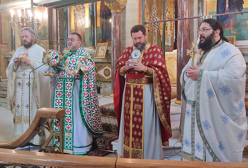 Саслуживали су старешина храма Свете Тројице – Руске цркве архимандрит Синесије Викторатос, протосинђел Василије Гавриловић и јеромонах др Амвросије Весић, у молитвеном присуству Митрополита Боцване и патријарашког егзарха Калахарија г. Генадија, јерарха Александријске патријаршије и великог пријатеља српског народа. За певницом је појао г. Страхиња Шабић, студент Теолошког факултета Националног каподистријског универзитета у Атини.