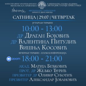 У оквиру Међународне духовне академије “Свети Јевстатије Превлачки” (26-30. јула) која се одржава у свештеној царској ларви Манастиру Светог Архангела Михаила – Михољској Превлаци код Тивта, данас, 29. јула, на тему „Митрополит Амфилохије – личност, дјело, мисија“ говориће др Драган Бојовић, др Валентина Питулић и Вишња Косовић.
