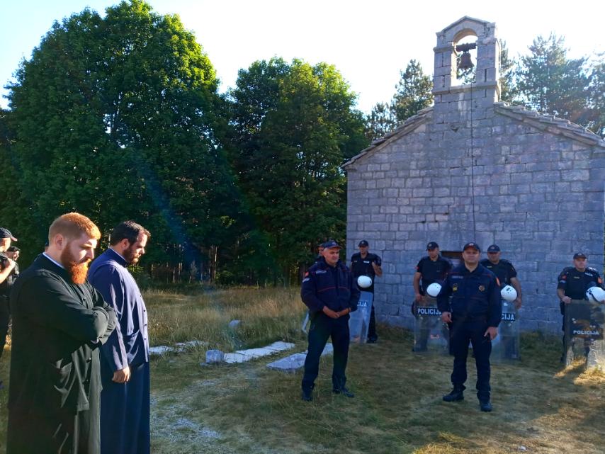 Службеници Полиције су јутрос, најприје на Цетињу, а потом и на лицу мјеста, обавијестили свештенство Митрополије да не могу да уђу у цркву јер се тамо већ налазе нека лица. Митрополија ће поводом оваквог спречавања и ометања вјерског обреда, као и неовлашћеног заузимања објекта Митрополије, предузети одговарајуће правне радње, а у обавиће и молитве малог освећења цркве, због тога што су особе који нису свештеници вршили у њој радње које су имале карактер вјерског обреда.