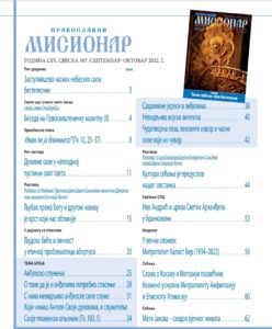 Садржај септембарско-октобарског броја званичног мисионарског гласила Српске Православне Цркве на првим страницама нам доноси казивање главног и одговорног уредника презвитера др Оливера Суботића. У свом уредничком уводнику отац Оливер је указао на значај небеских сила бестелесних, али и подсетио да се на светој Литургији благодаћу Божијом кроз руку свештенослужитеља савршава највеће чудо на свету, које је анђелима недоступно за подражавање и на које они са трепетом гледају.