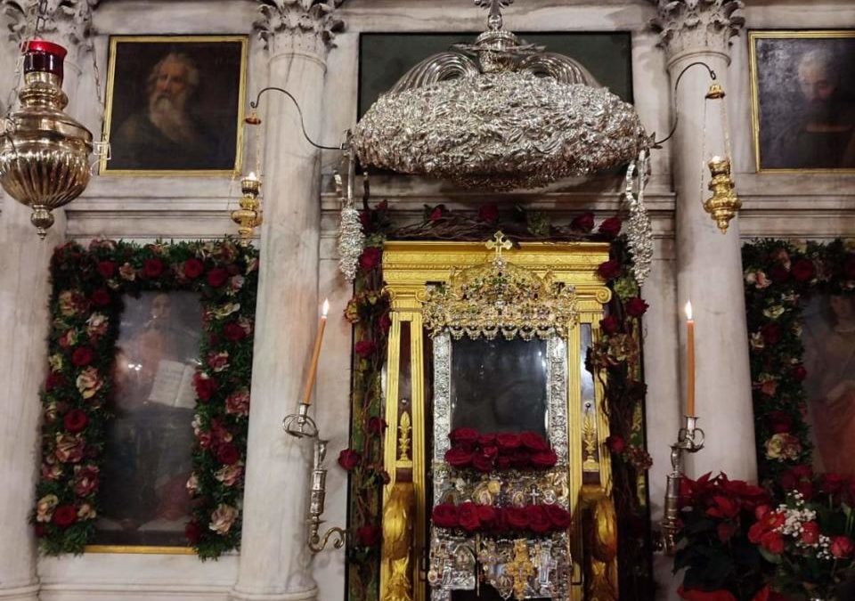 У недјељу, 11. децембра Свету литургију крај ћивота Светог Спиридона служио је Митрополит крфски г. Нектарије уз саслужење већег броја свештеника и монаха, пристиглих из разних крајева Грчке да прославе празник овог угодника Божјег. Међу њима су били и наши оци јеромонаси Пајсије, Евстатије, Јован, и протојереји Јован и Остоја. На крају Литургије извршен је свечани молитвени чин молебна Светитељу и изнијет негов ћивот на трон испред иконостаса. Новина, за оне који су први пут ходочастили Светом Спиридону, била је локална традиција хорског појања на Литургији уз пратњу хармонијума, а посебно је снажан утисак оставило одавање почасти Светитељу од стране великог оркестра филхармоније. Сви музичари, а било их је преко педест, одјевени у свечане униформе са металним капама попут шљема и украшеним високим кићанкама, послије свештеника који су отпјевали тропар Светом Спиридону, свирали су у најсвечанијем тренутку изношења светитељевог ћивота из олтара и постављања у трон пред иконостас. Озарена лица владике, свештенства, неколико хиљада Божјих душа пристиглих са разних крајева земаљског шара и наравно домаћег становништва, спојени са мирисом тамјана, пламеновима свијећа и кандила, појањем и мелодијом оркестара које су пратили снажни звуци великих звона и одјеци почасне топовске паљбе са тврђаве, чинили су да тај чин буде испуњен узвишеним духовним осјећањем. Заиста, тренуци који се неизбрисиво урежу у духовно биће сваке душе која са вјером и љубављу приступа Светитељу. По завршетку богослужења, наши свештеници и монаси предали су дарове Митрополиту Нектарију, који је и у бесједи посебно поздравио ходочаснике из Црне Горе. Протосинђел Пајсије је предао лични дар Митрополита Јоаникија – наливперо блаженопочившег Митрополита Амфилохија, који је дуги низ године био пријатељ са Митрополитом Нектаријем и више пута ходочастио на Крф и Видо. Митрополит Нектарије је узвратио достојним уздарјем и споменуо да са радошћу носи успомене са ходочашћа Светом Василију Острошком ове године и литије Превлачких свештеномученика коју је предводио у Тивту. Монаси и монахиње су предали на дар нешто од свога рукодеља: мед, воштане свијеће, бројанице, сок од нара, вино, лозу и дуборез.