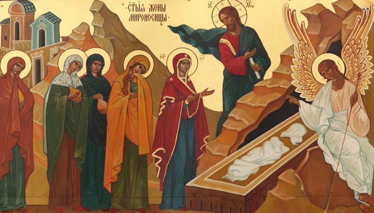 Које су то жене којима се Господ прво јавио? Јеванђелисти нам о њима дају довољно података. Међу њима је прва Марија Магдалина, позната грешница из које је Христос својевремено изагнао седам бесова, тј. седам смртних грехова: гордост, среброљубље, блуд, гњев, завист, чревоугодије, лењост. Друга је Марија, мати Јаковљева и Јосијина (Мт. 27,56); трећа – Саломија жена Заведејева, а мати апостола Јакова и Јована (Мк. 15,40); четврта – Марија Клеопова (Јн. 19,25); затим пета и шеста: „Јована, жена Хузе пристава Иродова и Сусана и друге многе које служаху њему имањем својим“ (Лк. 8,3).