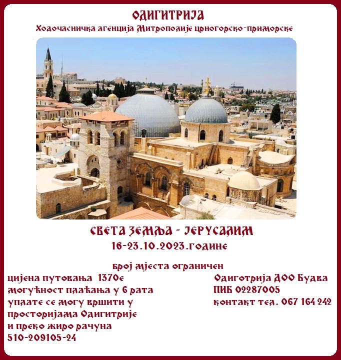 Ходочасничка агенција Митрополије црногорско-приморске “Одигитрија” организује од 16. до 23. октобра 2023. године поклоничко путовање у Свету земљу – Јерусалим.