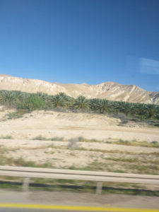 Послије не више од сата вожње, аутобус залази у неке врлети, а онда нагло избија на руб Јорданске долине или, како је географи зову – Велике пукотине ријеке Јордан, која раздваја Израел и Палестину од државе Јордан, све од Галилејког језера до Мртвог мора. За разлику од јорданске (лијеве) стране, која је, чини се, већим дијелом плодна равница, са житним пољима и виноградима, десна – израелска и палестинска страна, посебно у горњем појасу, права је пустиња. Ипак, објашњава нам водич, системом наводњавања из Јордана, појас уз ријеку претворен је добрим дијелом у плодно земљиште са огромним засадима датула – урминих палми.