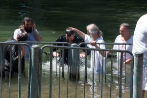 Не зам како то раде други свештеници који предводе поклоничке групе, али наши су приредили праву јеванђељску сцену. Први је у воду ушао о. Остоја, онако, у мантији, а за њим игуман Јефтимије да би један другога, као на крштењу, три пута, у име Оца и Сина и Светога Духа, загњурили у ријеку. Онда је Остоја, с њему својственом радошћу, са свима нама, обученим у бијеле стихаре, урадио исто, «примајући на себе све наше грехове», након чега смо, сви, и стари и млади, «прозрачни и лаки», као новорођени, усхићено запливали ријеком, као никад прије. Било је ту и гласног смијеха, цике и довикивања. Као на каквом дјечјем купалишту. Право рећи, ако је о. Остоја сјајно «одиграо» улогу Св. Јована Крститеља, ни ми, фарисеји и књижевници, нијесмо себе изневјерили.