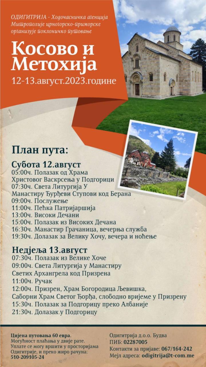 “Одигитрија”, ходочасничка агенција Митрополије црногорско-приморске, 12-13. августа организује поклоничко путовање на Косово и Метохију.