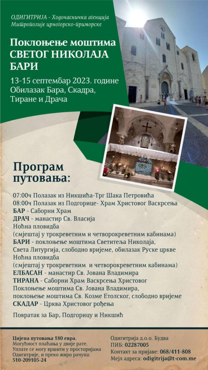 Ходочасничка агенција Митрополије црногорско-приморске “Одигитрија” организује од 13-15. септембра 2023. године из Никшића, Подгорице и Бара поклоничко путовање у Бари, Италији, на поклоњење моштима Светог Николе Мирликијског.