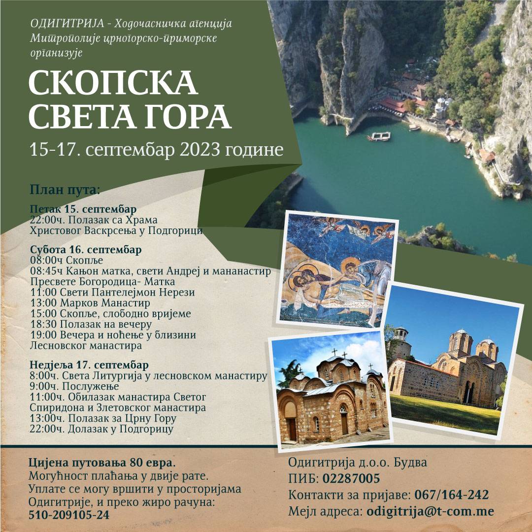 “Одигитрија”, ходочасничка агенција Митрополије црногорско-приморске, 15-17. септембра организује обилазак Скопске Свете Горе.
