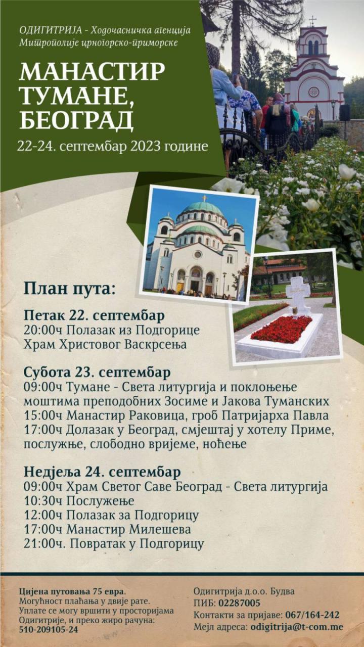 Ходочасничка агенција Митрополије црногорско-приморске “Одигитрија”, организује 22-24. септембра путовање за Србију у оквиру којег ће поклоници обићи манастир Тумане, као и манастир Раковица, гдје је сахрањен светопочивши Патријарх Павле, Храм Светога Саве на Врачару, манастир Милешева.