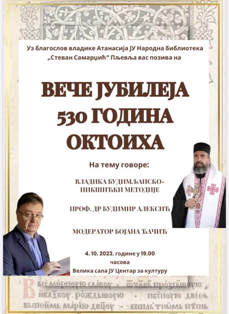 Уз благослов Владике милешевског Атанасија, ЈУ Народна библиотека „Стеван Самарџић” Пљевља вечерас организује „Вече јубилеја 530 година Октоиха“, прве српске ћириличне књиге, са почетком у 19 часова.