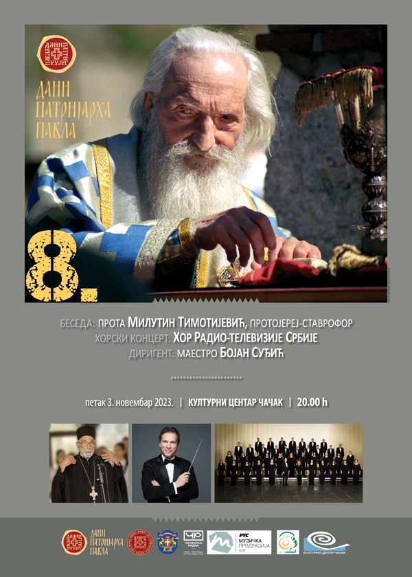 У оквиру 8. „Дана Патријарха Павла“ у Чачку, Кућанцима, Гацку, Никшићу и Призрену, у организацији Удружења „Павле – живот по Јеванђељу“, у петак, 3. новембра 2023. године, у 20 часова, у великој сали Културног центра у Чачку, одржаће се свечана академија у част Патријарха Павла. Свечану академију чини целовечерњи концерт хора Радио Телевизије Србије под управом маестра Бојана Суђића, као и беседа о јеванђелском животу Патријарха Павла. Беседиће протојереј-страврофор Милутин Тимотијевић, некадашњи професор и ректор Призренске богословије.