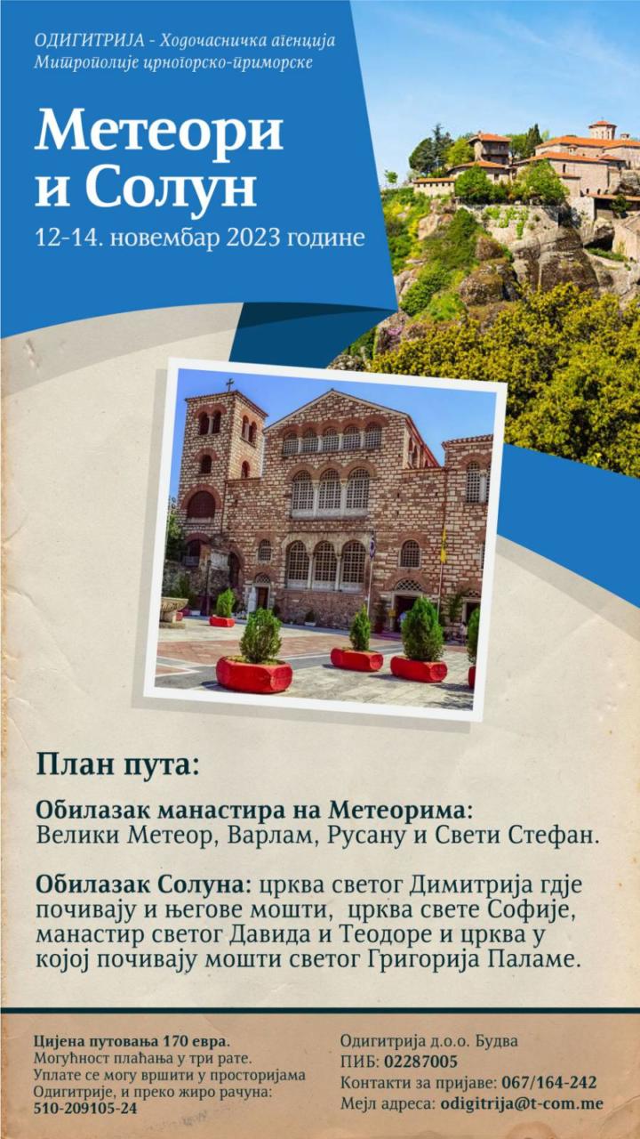 Ходочасничка агенција Митрополије црногорско-приморске “Одигитрија” организује 12-14. новембра поклоничко путовање за Меторе и Солун.