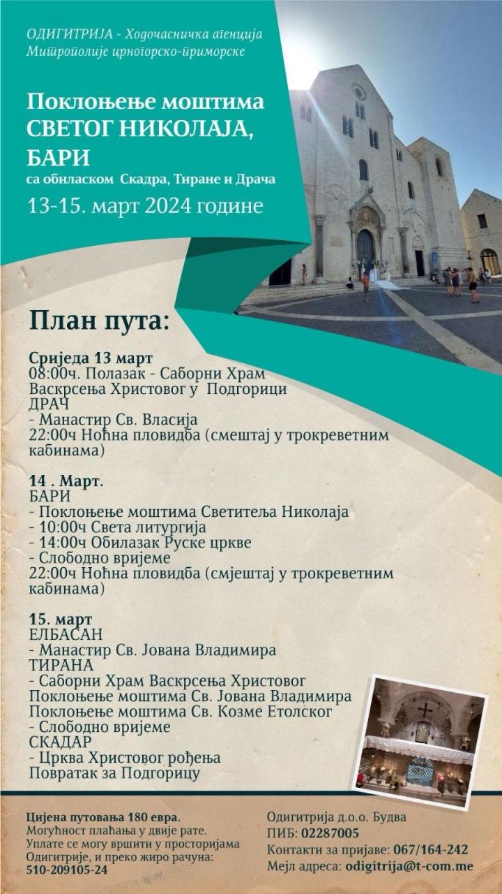 „Одигитрија”, ходочасничка агенција Митрополије црногорско-приморске, од 13. до 15. марта организује из Подгорице поклоничко путовање у Бари ( Италија) на поклоњење моштима Светог Николаја Мирликијског Чудотворца.
