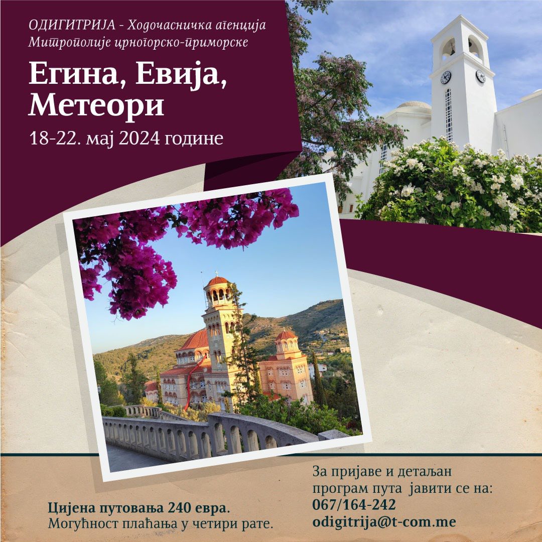 “Одигитрија”, ходочасничка агенција Митрополије црногорско-приморске, од 18. до 22. маја организује поклоничко путовање за Грчку – Егина, Евија, Метеори.