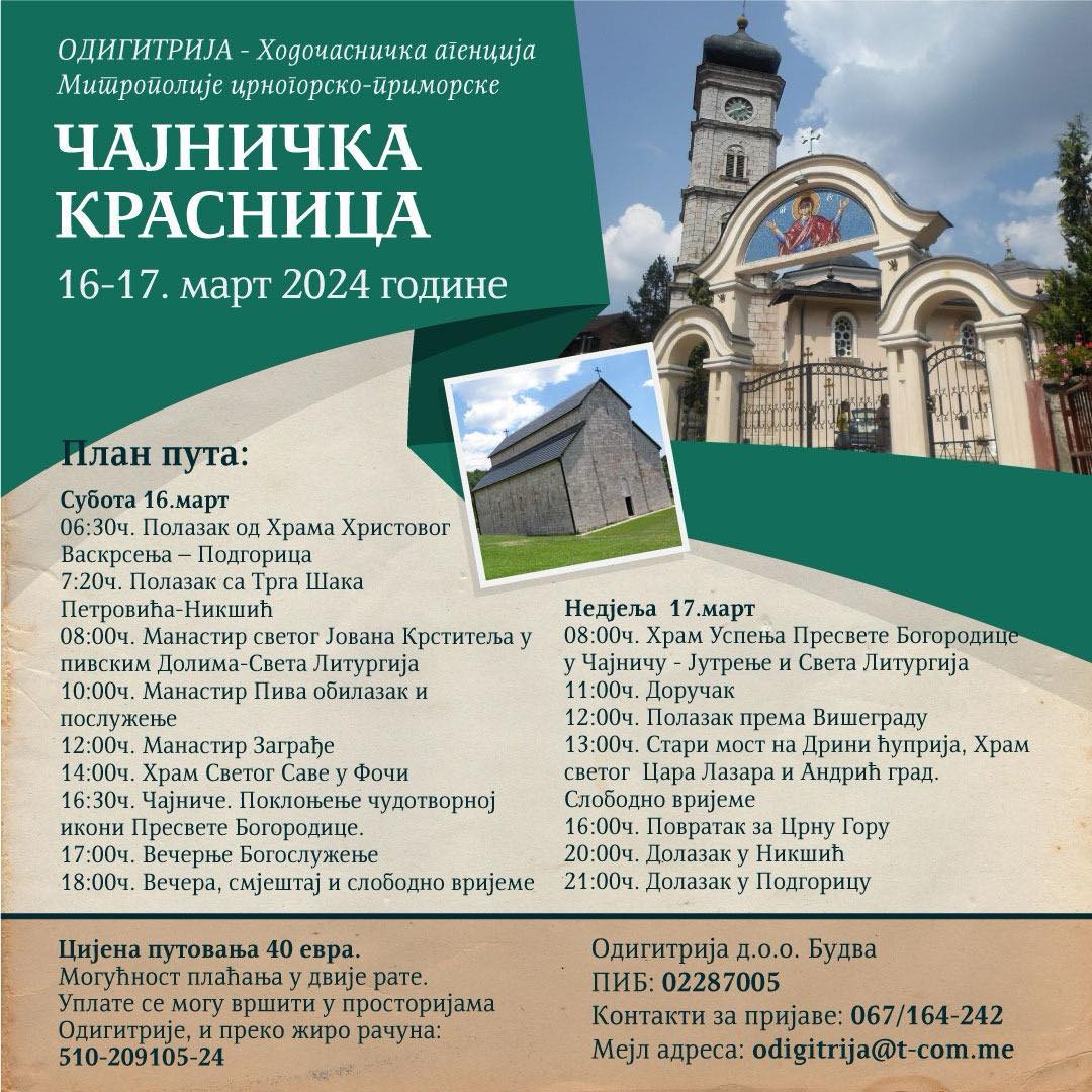 “Одигитрија”, ходочасничка агенција Митрополије црногорско-приморске, од 16. до 17. марта из Подгорице и Никшића организује путовање у Чајниче (Република Српска), на поклоњење Чајничкој Красници, коју је по предању насликао Свети апостол и јеванђелиста Лука.