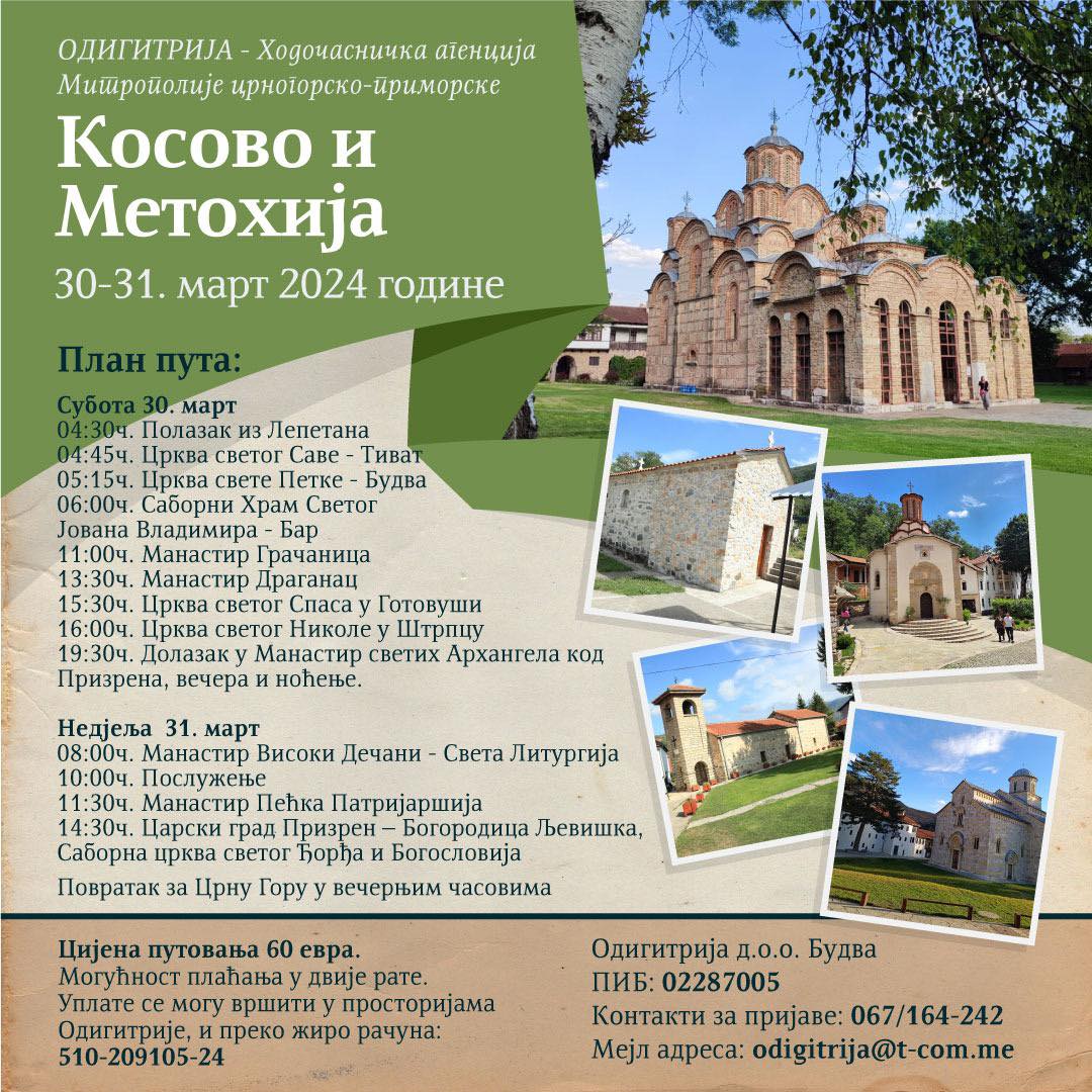 Ходочасничка агенција Митрополије црногорско-приморске “Одигитрија” организује 30-31. марта из Лепетана, Тивта, Будве и Бара поклоничко путовање на Косово и Метохију.