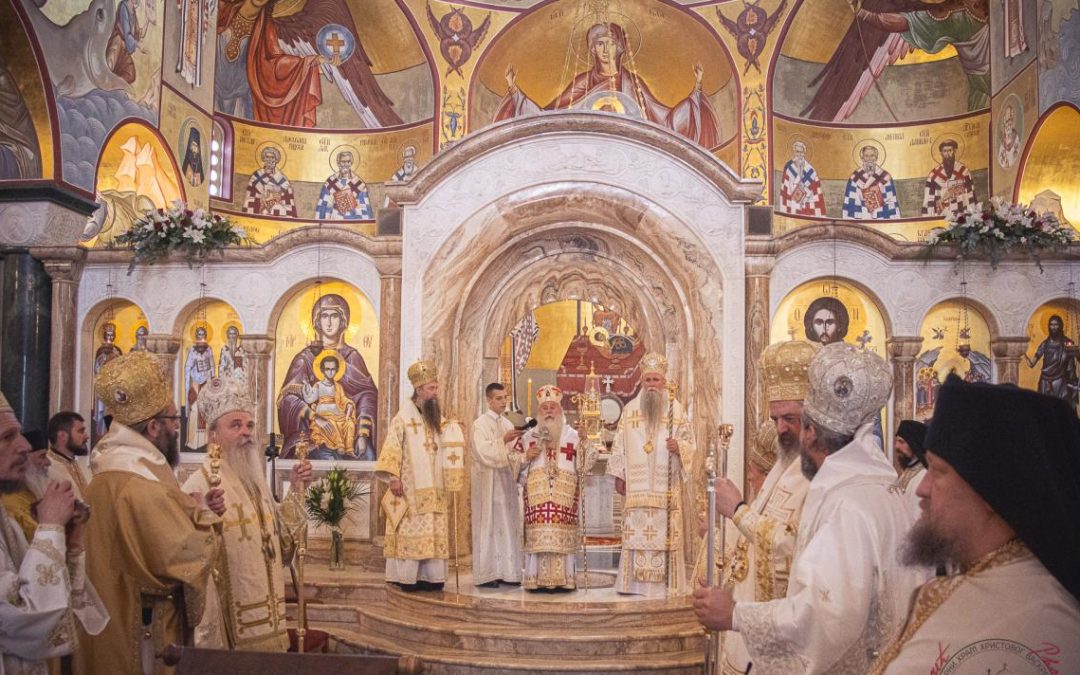 Светом архијерејском Литургијом је началствовао Његово Високопреосвештенство Митрополит дабробосански Хризостом, уз саслужење Његовог Високопреосвештенства Митрополита црногорско-приморског Јоаникија и њихових преосвештенстава: Епископа сергијевско-посадског и дмитровског Кирила, Епископа милешевског Атанасија, Епископа рашко-призренског Теодосија, Епископа славонског Јована, Епископа аустралијско-новозеландског Силуана, Епископа ваљевског Исихија, Епископа будимљанско-никшићког Методија и Епископа захумско-херцеговачког Димитрија, као и изабраног Епископа диоклијског протосинђела Пајсија, који је у току Свете службе, одлуком Светог Архијерејског Синода, руком Митрополита Јоаникија, рукопроизведен у чин архимандрита.