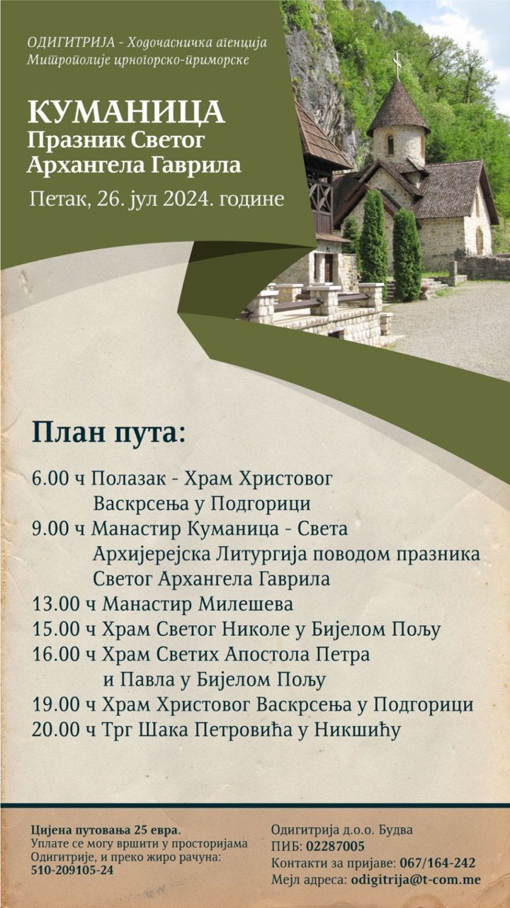 Поводом славе манастира Куманица – Сабора Светог архангела Гаврила, ходочасничка агенција Митрополије црногорско-приморске “Одигитрија” организује 26. јула посјету овој светињи, а у повратку и обилазак више манастира у Пријепољу и Бијелом Пољу.