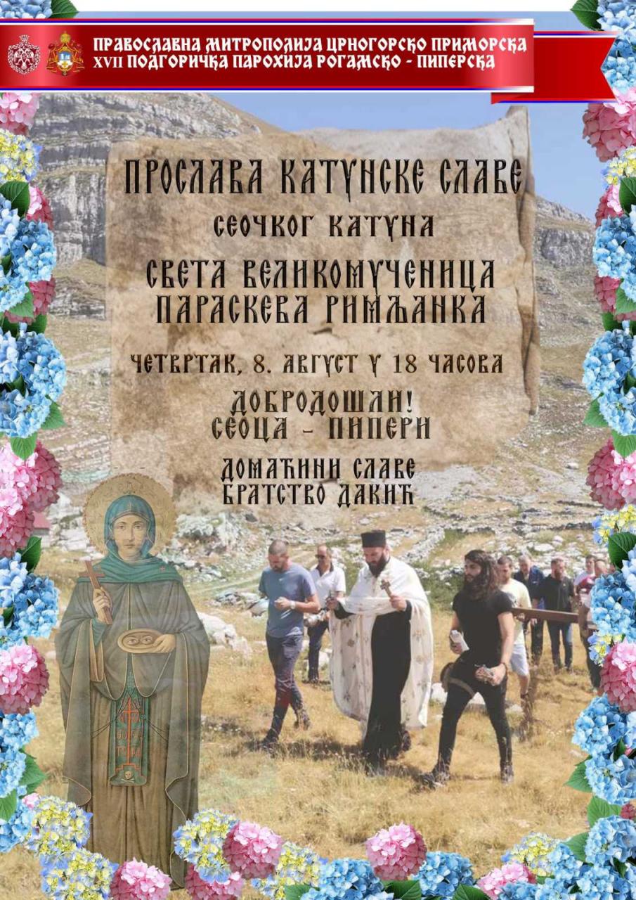Сеочки катун (Горња Лукавица) прославиће своју славу – Свету Параскеву Римљанку, у четвртак, 8. августа, у Сеоцима (Пипери), са почетком у 18 часова.