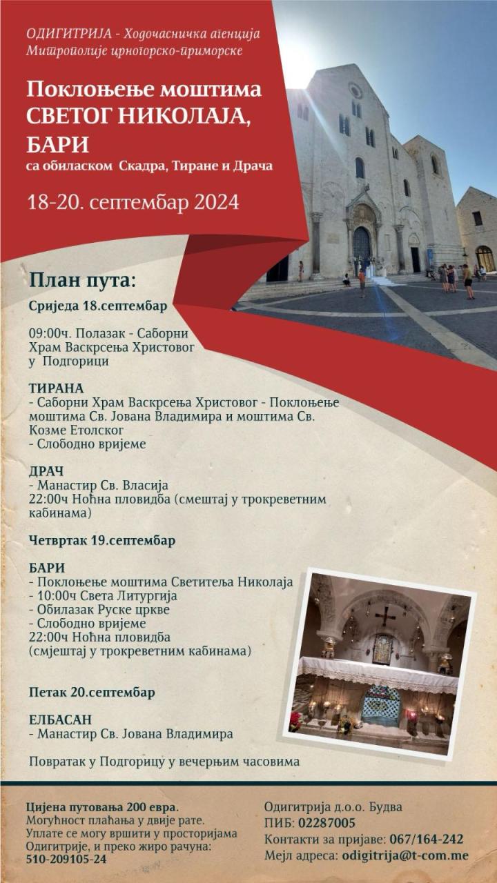 Ходочасничка агенција Митрополије црногорско-приморске “Одигитрија” 18-20. септембра организује из Подгорице путовање у Бари (Италија) са обиласком Скадра, Тиране и Драча (Албанија), на поклоњење моштима Светог Николаја Мирликијског Чудотворца, Светог Јована Владимира и Светог Козме Етолског.