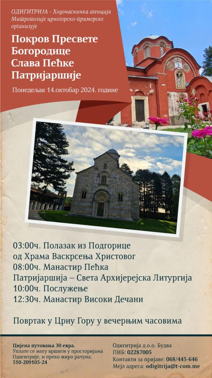 Поводом празника Покрова Пресвете Богородице – славе Пећке патријаршије, Ходочасничка агенција Митрополије црногорско-приморске „Одигитрија“ организује 14. октобра ходочашће овом ставропигијалном манастиру.