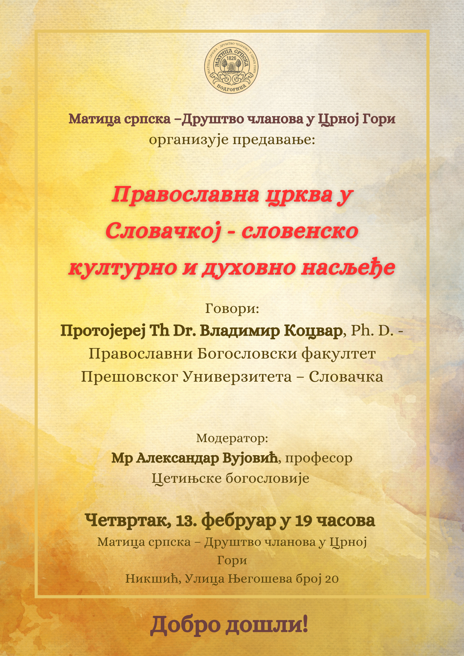 У четвртак 13. фебруара 2025. године, са почетком у 19 часова, у организацији Матице Српске – Друштва чланова у Црној Гори, биће уприличено предавање и разговор на тему „Православна црква у Словачкој – словенско културно и духовно наслеђе“, које ће одржати протојереј Th Dr. Владимир Коцвар, Ph.D. модератор предавања и разговора биће мр Александар Вујовић, професор Богословије Светог Петра Цетињског.
