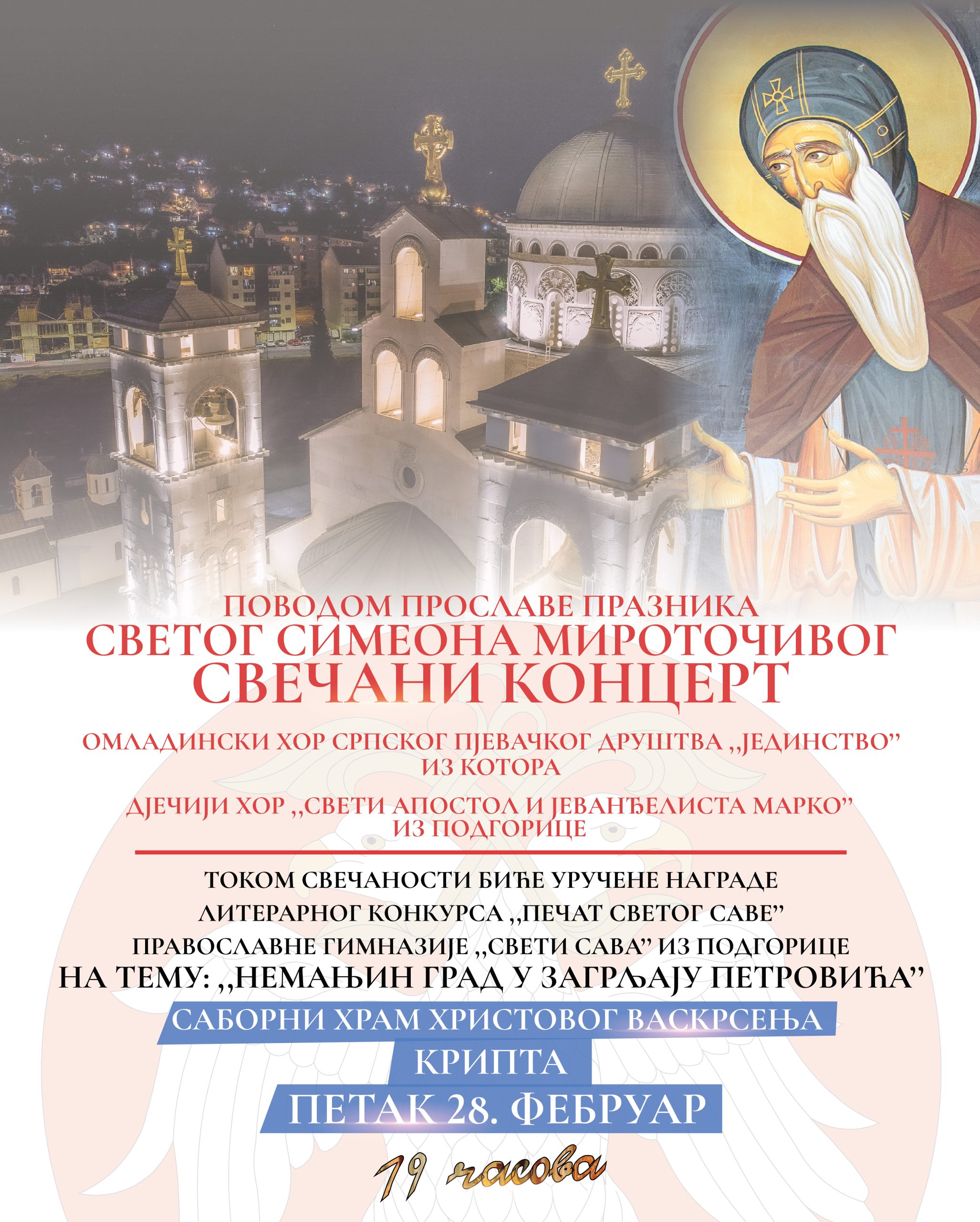 У петак 28. фебруара 2025. године са почетком у 19 часова у крипти Саборног храма Христовог Васкрсења у Подгорици поводом празника Светог Симеона Мироточивог, одржаће се свечани концерт у којем ће узети учешћа омладински хор Српског пјевачког друштва ,,Јединство” из Котора и дјечији хор ,,Свети апостол и јеванђелиста Марко” из Подгорице.