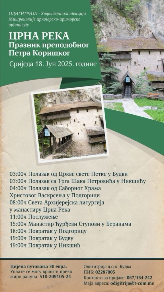 Одигитрија – Ходочасничка агенција Митрополије црногорско – приморске за празник Преподобног Петра Коришког, у сриједу, 18. јуна, организује поклоничко путовање у Манастир Црна река.