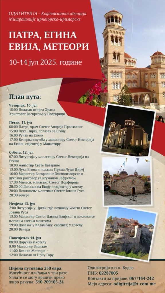 Одигитрија – Ходочасничка агенција Митрополије црногорско – приморске од 10. до 14. јула организује поклоничко путовање на Егину, Евију и Метеоре.