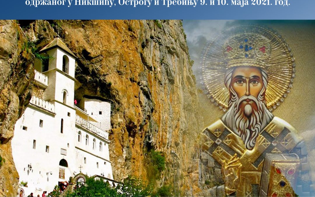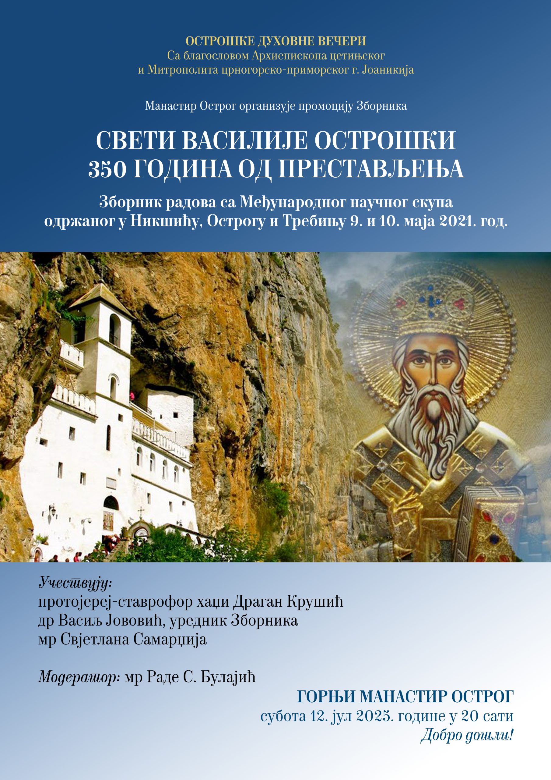 Са благословом Архиепископа цетињског и Митрополита црногорско-приморског г. Јоаникија, у оквиру Острошких духовних вечери, манастир Острог организује промоцију Зборника „Свети Василије Острошки-350 година од престављења“– зборник радова са Међународног научног скупа одржаног у Никшићу, Острогу и Требињу 9. и 10. маја 2021. године.
