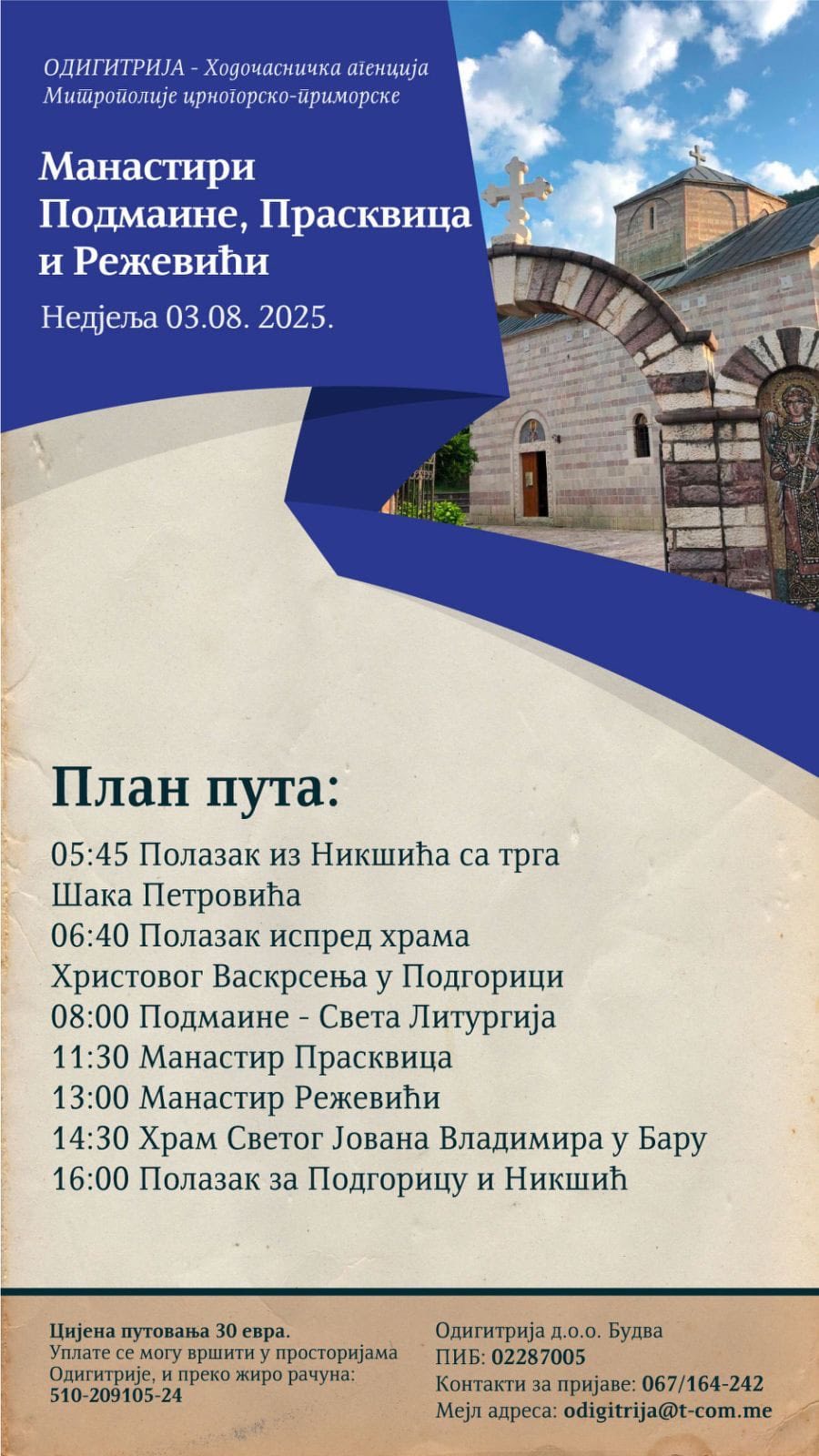 Ходочасничка агенција Митрополије црногорско-приморске – Одигитрија организује у недјељу, 3. августа, обилазак манастира Подмаине, Прасквица и Режевићи, те Саборног храма Светог Јована Владимира у Бару.