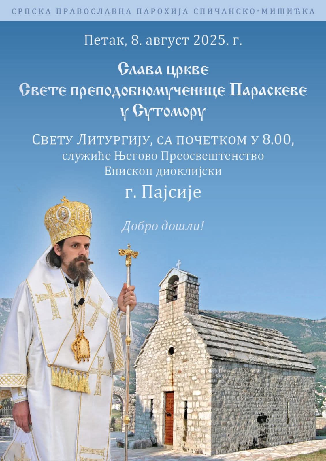 Његово преосвештенство Епископ диоклијски господин Пајсије служиће у петак, 8. августа, Свету литургију у цркви Свете преподобномученице Параскеве у Сутомору, поводом славе овог древног немањићког храма из XIII вијека.