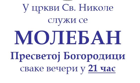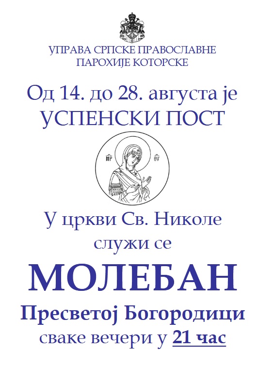 У Цркви Светог Николе у Котору, у току Успенског поста (од 14. до 28. августа) сваке вечери служиће се молебан Пресветој Богородици са почетком у 21 сат.