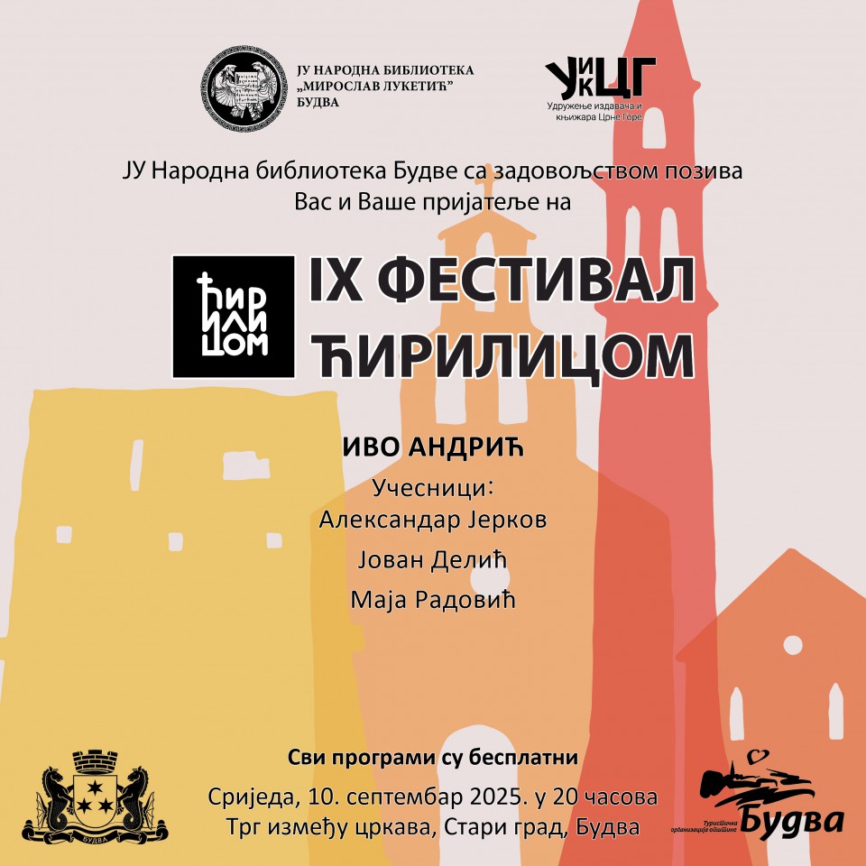 На програму IX Фестивала „Ћирилицом“ у Будви, сјутра, 10. септембра, са почетком у 20 часова, на Тргу између цркава, разговараће се о Иву Андрићу, једином нашем писцу добитнику Нобелове награде за књижевност (1961). На тему „Главни јунак код Андрића“ говориће академик Јован Делић и проф. др Александар Јерков, саопштено је из Народне библиотеке Будва.