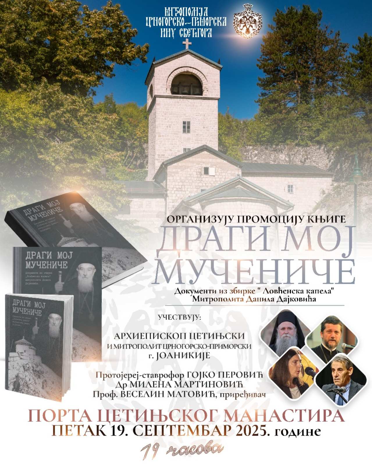 Митрополија црногорско-приморска и Издавачко-информативна установа ”Светигора” организују, у петак 19. септембра, у порти Цетињског манастира, промоцију књиге ”Драги мој мучениче” – Документи из збирке ”Ловћенска капела” Митрополита Данила Дајковића.