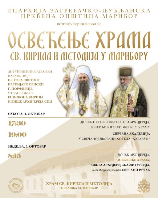 Епархија загребачко-љубљанска са радошћу и благодарношћу обавештава верни народ да ће у недељу, 5. октобра 2025. године, бити извршено велико освећење Храма Свете браће Кирила и Методија у Марибору.