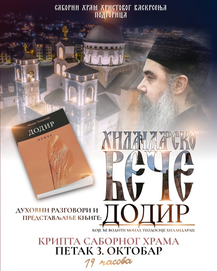 У оквиру програма „Хиландарско вече“, у петак 3. октобра 2025. године, у крипти Саборног храма Христовог васкрсења у Подгорици, одржаће се духовни разговори и представљање књиге „Додир“ монаха Теодосија Хиландарца, са почетком у 19 часова. Међу корице ове књиге монах Теодосије удјенуо је 28 прича.