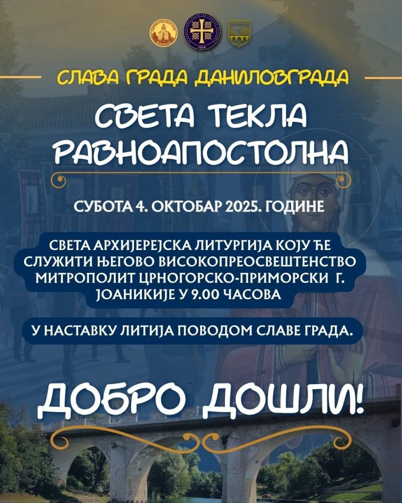 Поводом славе града и Саборног храма Свете Текле у Даниловграду, у суботу 4. октобра у 9 часова, Његово високопреосвештенство Архиепископ цетињски Митрополит црногорско-приморски г. Јоаникије са свештенством и народом Божијим, служиће Свету архијерејску литургију у овој светињи посвећеној првомученици равноапостолној Текли. Митрополит ће потом предводити литију улицама града и освештати славски колач, који ове године као домаћин приноси Општина Даниловград.