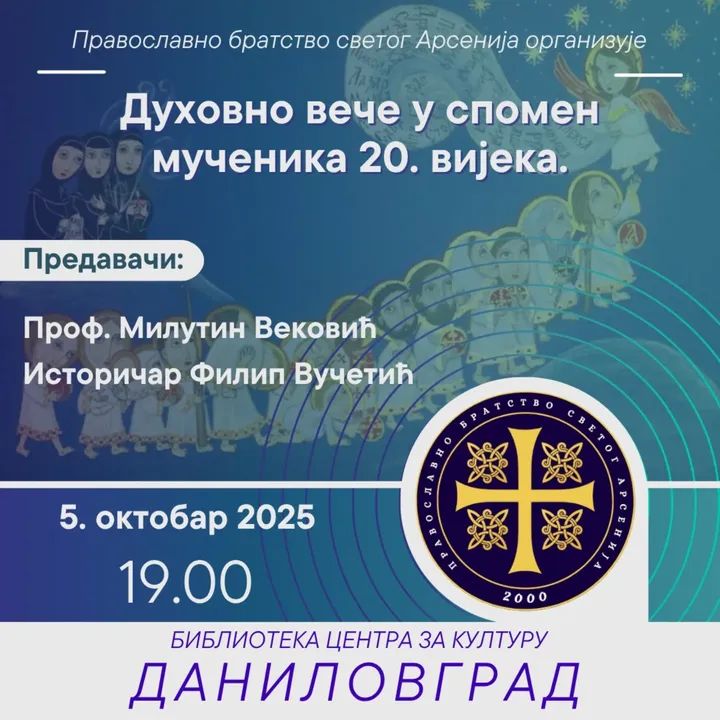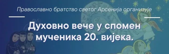Православно братство Светог Арсенија организује „Духовно вече у спомен мученика 20. вијека“ на којем ће говорити предавачи проф. Милутин Вековић и историчар Филип Вучетић.