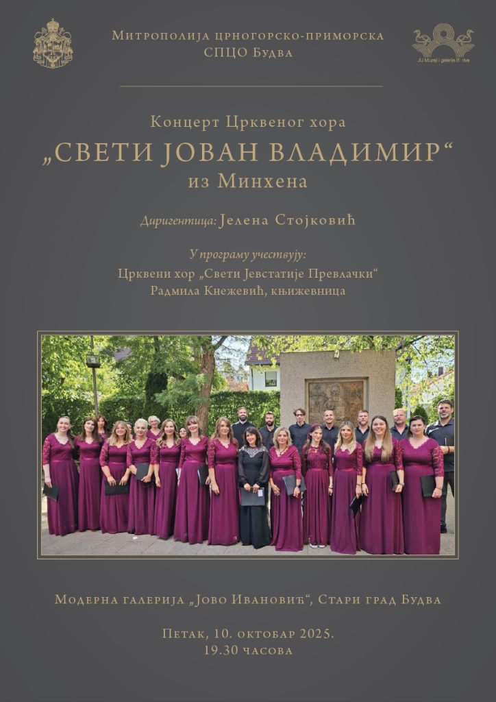 У петак, 10. октобра у Модерној галерији „Јово Ивановић“ у Старом граду Будви, одржаће се концерт Црквеног хора „Свети Јован Владимир“ из Минхена, са почетком у 19.30 часова.