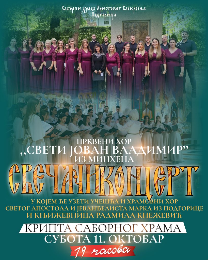 Свечани концерт православног црквеног хора „Свети Јован Владимир“ из Минхена одржаће се у суботу, 11. октобра 2025. године, у крипти Саборног храма Христовог Васкрсења у Подгорици, са почетком у 19 часова.