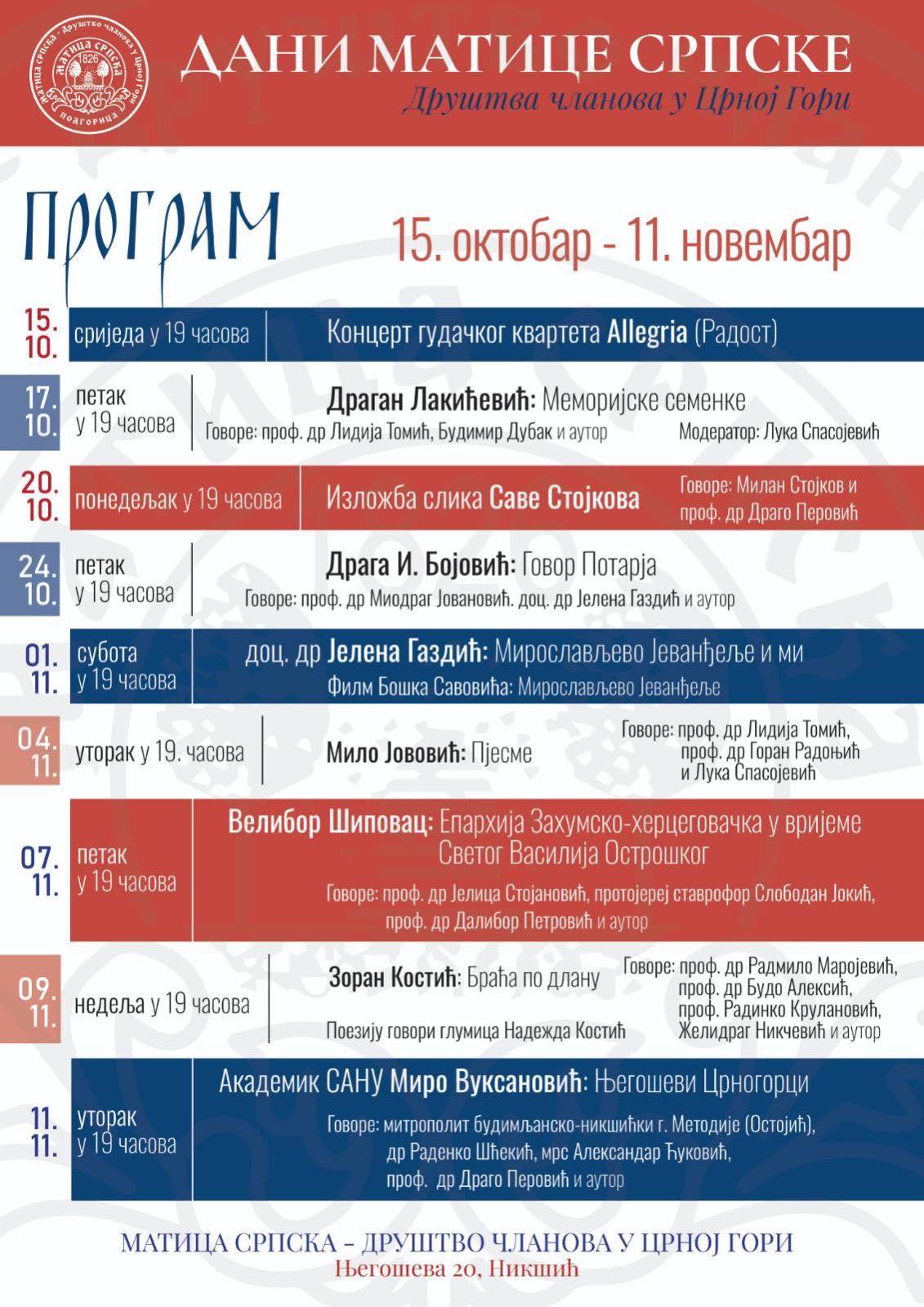 Сви догађаји ће се одржавати у просторијама Матице српске – Друштва чланова у Црној Гори у Никшићу, са почетком у 19 часова.