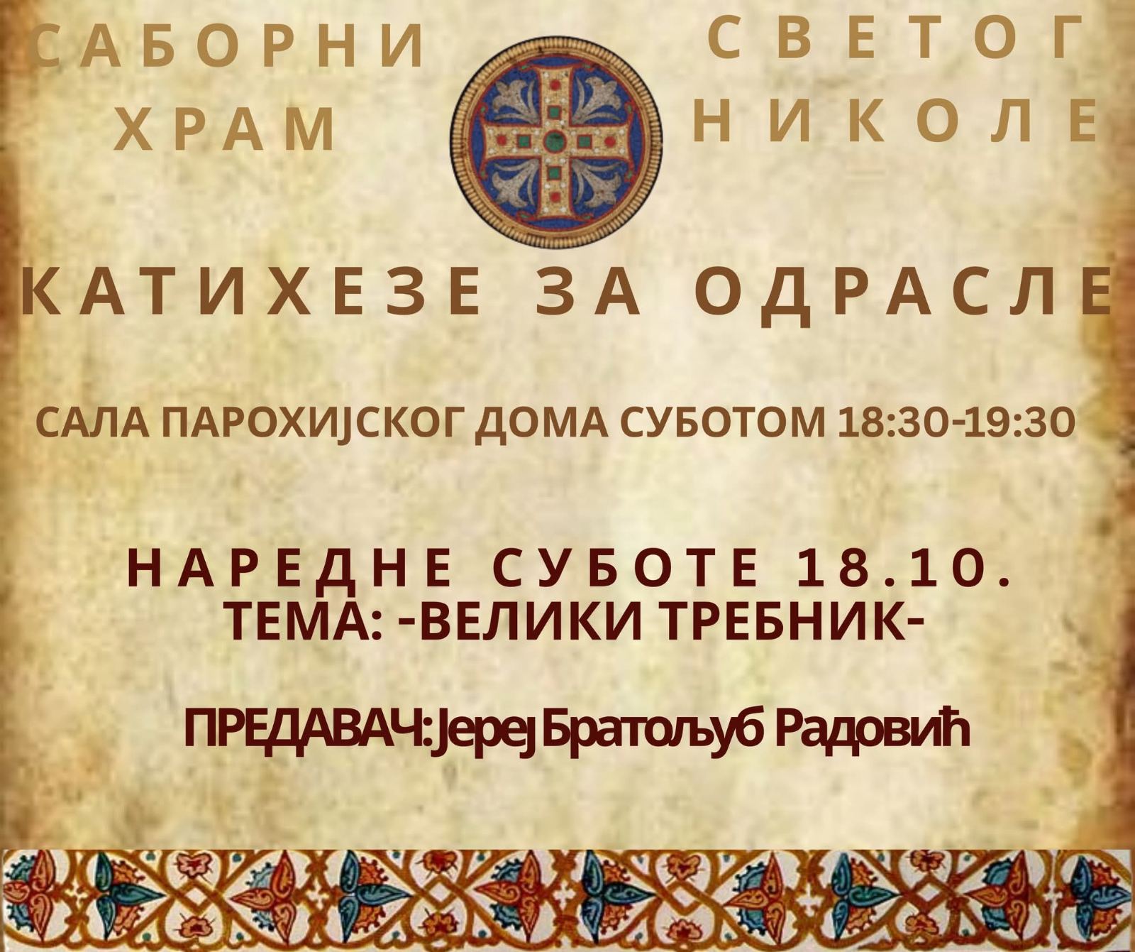 Свештеник Братољуб Радовић говориће на тему Велики требник.