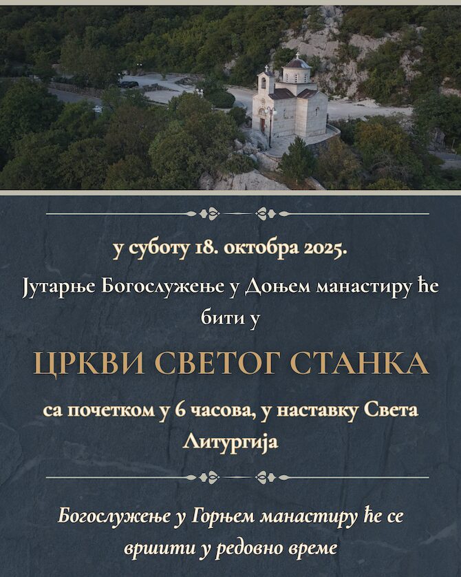 Манастир Острог обавјештава вјернике да ће се у суботу, 18. октобра, јутарње богослужење у Доњем манастиру служити у Цркви Светог Станка са јутрењем у 6 сати и Светом литургијом у наставку.