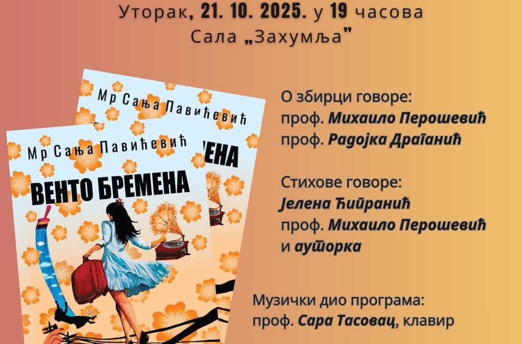 Јавна установа „Захумље“ за све љубитеље поезије и умјетности у Никшићу у уторак, 21. октобра 2025. године, организује промоцију збирке поезије „Венто бремена“ ауторке мр Сање Павићевић.